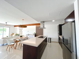 El concepto abierto integra sala, comedor y cocina con isla central totalmente equipada, generando funcionalidad y amplitud.